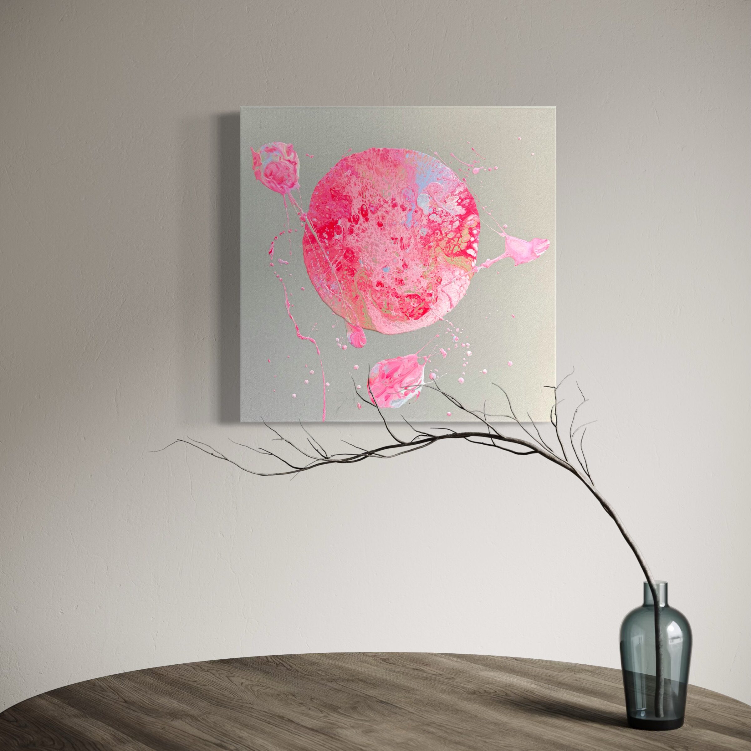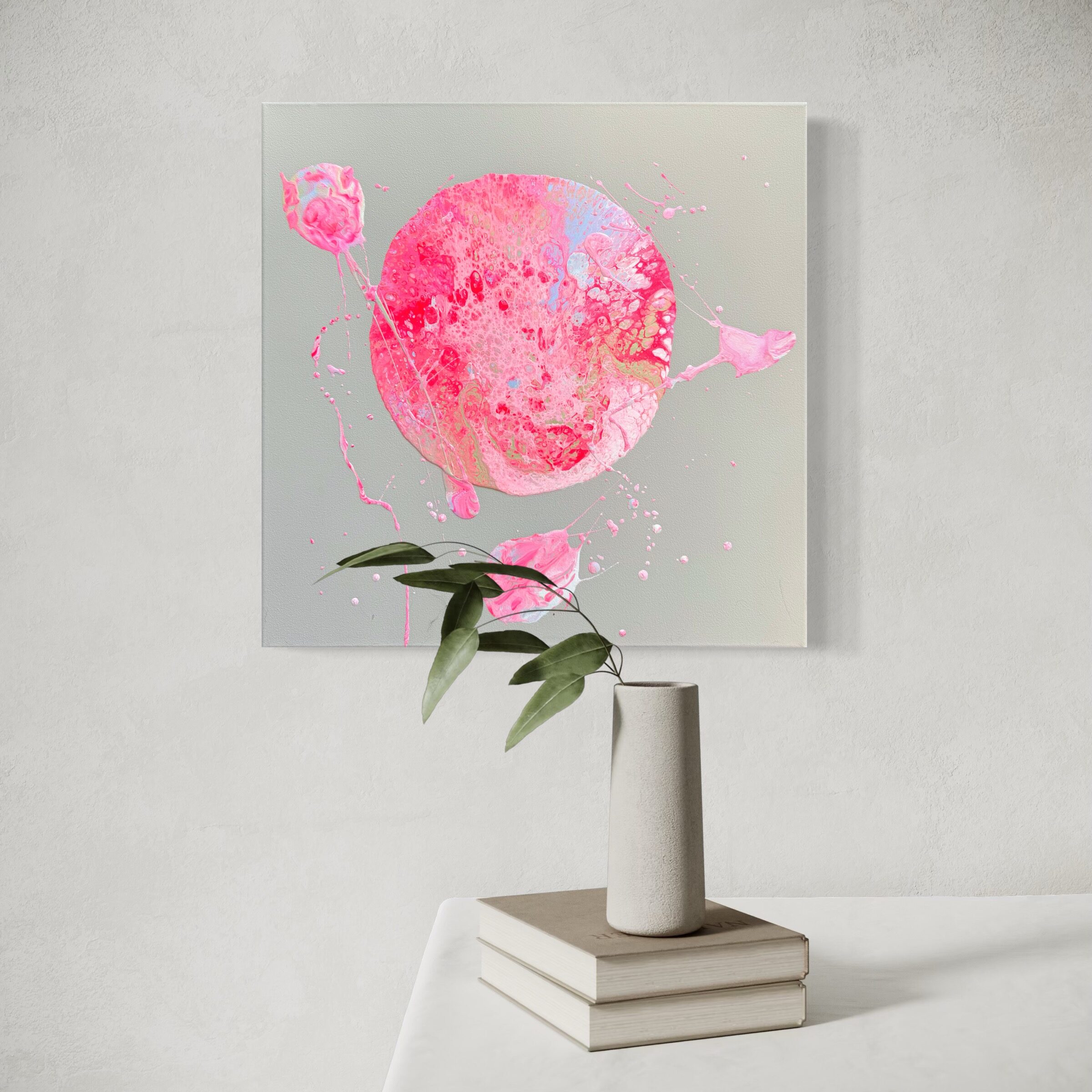 Ich bin Kosmos, Leuchtkraft und sprühende Freude. In meinen neonpinken, roten und blauen Tönen schimmere ich wie ein ferner Planet, umgeben von Spritzern und einem Hauch Grün – lebendig, futuristisch und magnetisch. Auf grauem Grund