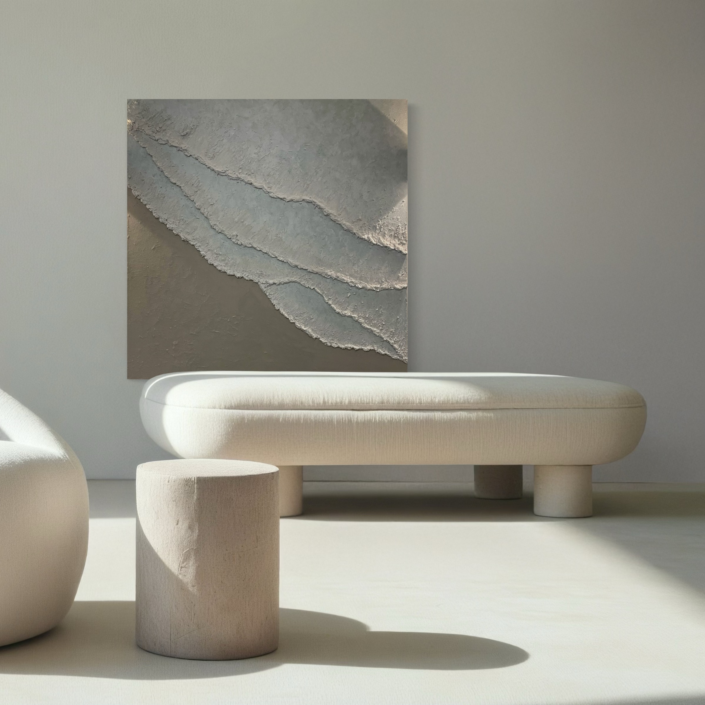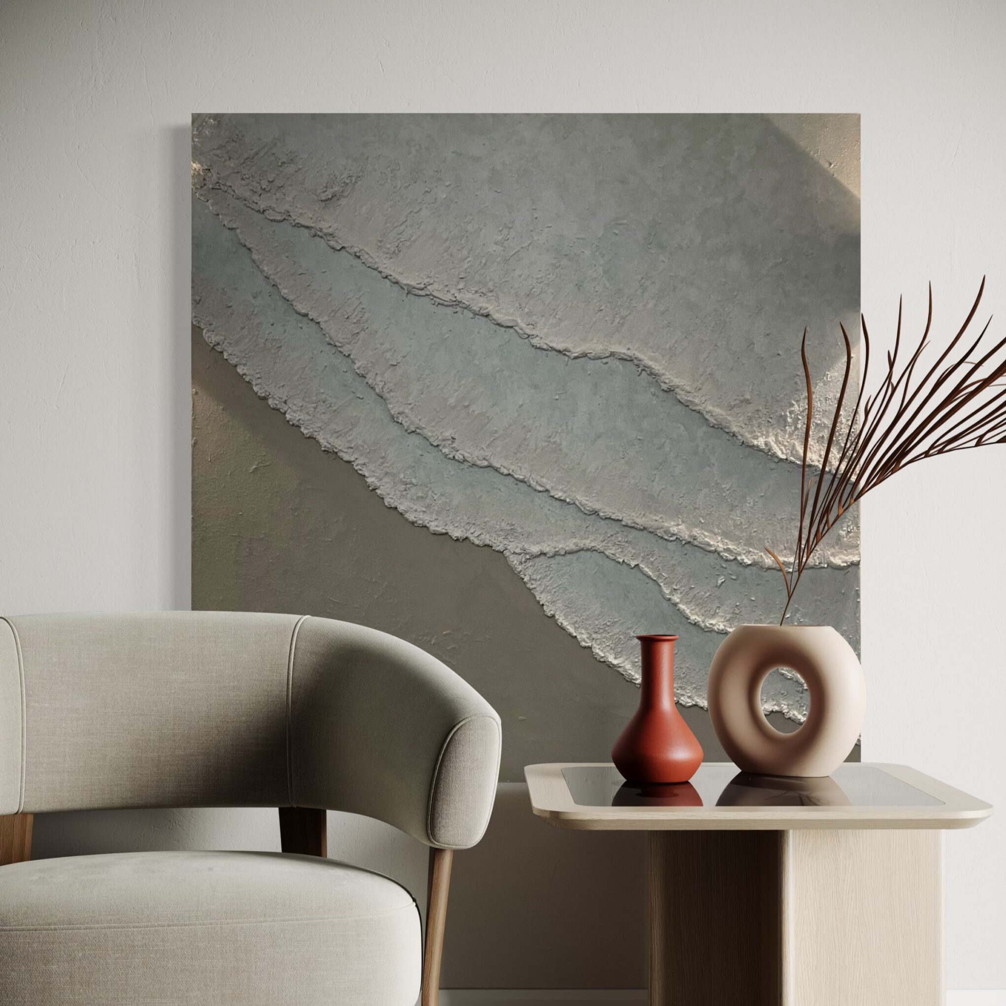 Ich bin Strand, Welle und erdige Gelassenheit. In meinen grauen und braunen Schichten wellen sich Dünen wie salziger Sand unter dem Wind – texturiert, beruhigend und voller natürlicher Weisheit.