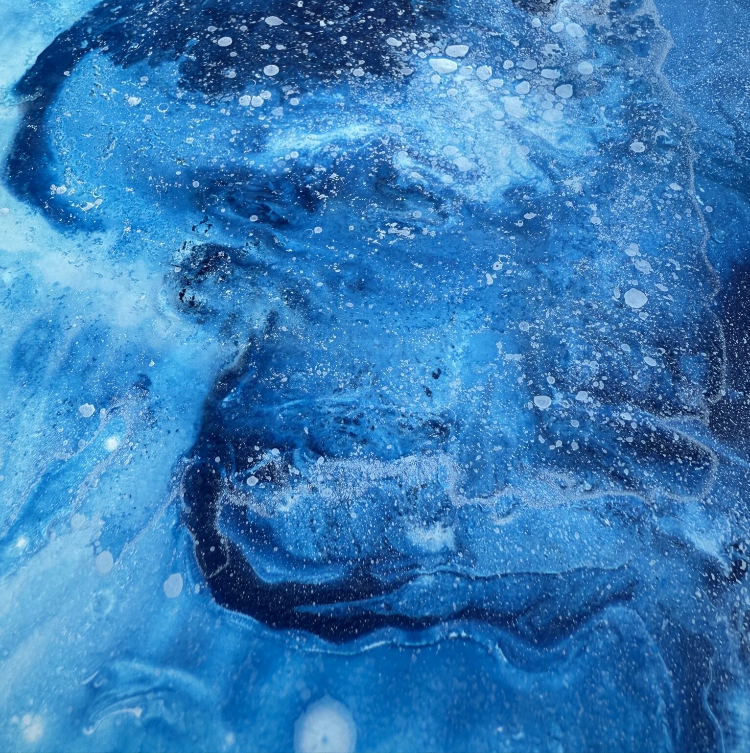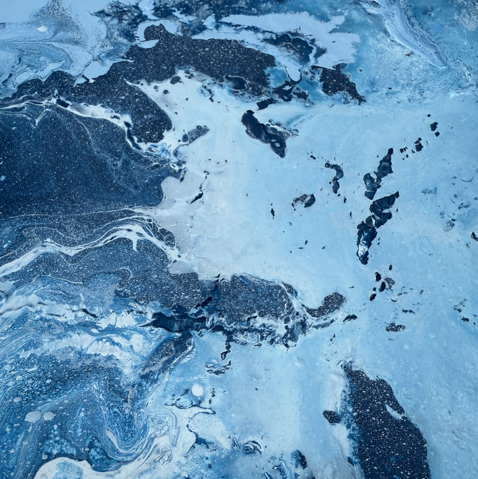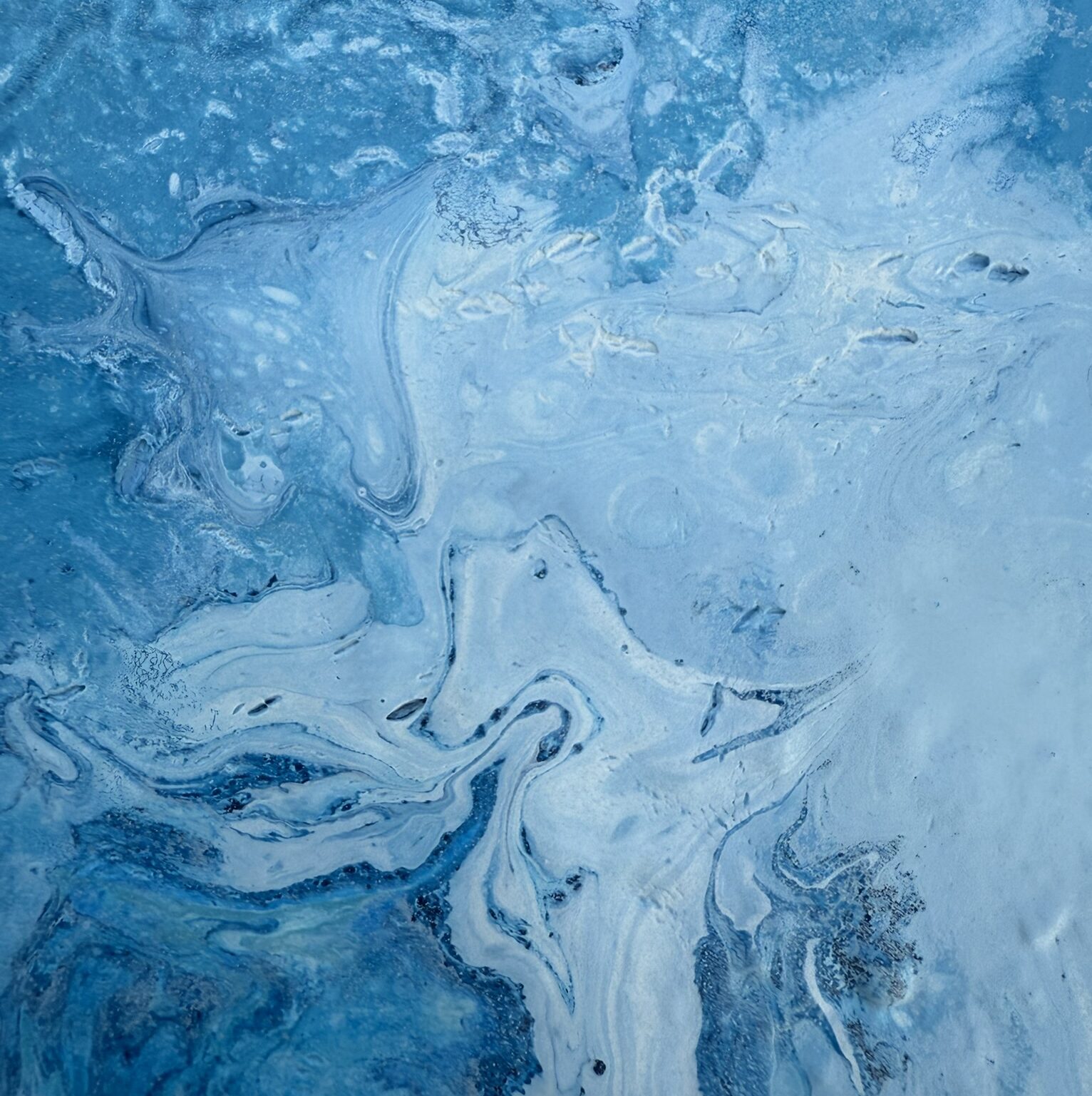 Ich bin Flüstern, Geheimnis und ozeanische Tiefe. In meinen schimmernden Blau- und Weißtönen breiten sich Formen wie Wellenschaum aus, durchsetzt mit dunkleren Schattierungen und einem Hauch Grün – sanft, einladend und voller verborgener Geschichten.