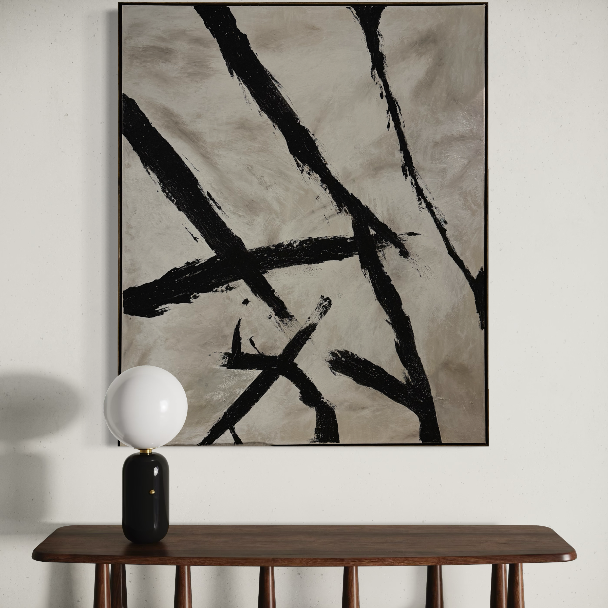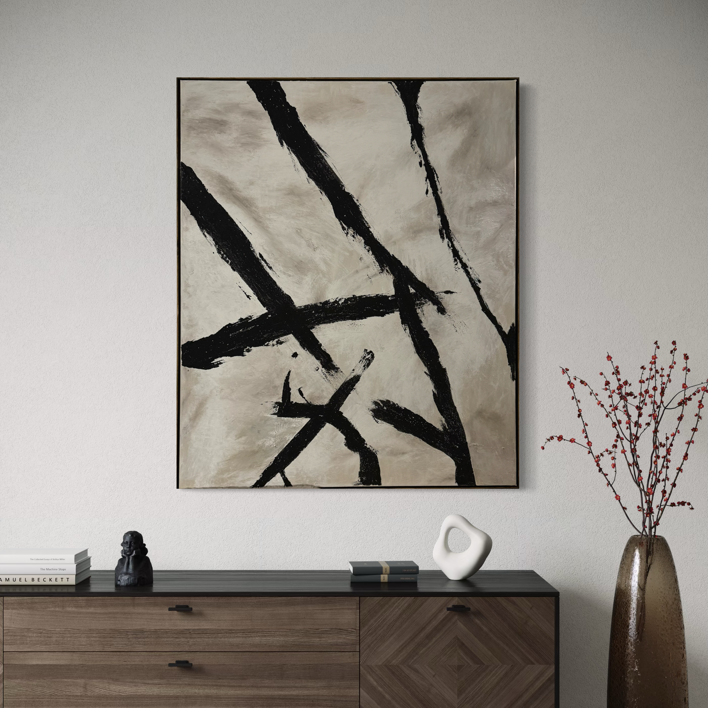 Ich bin Reduktion, Stärke und der Mut zum Wesentlichen. Mit meinen schwarzen Pinselstrichen auf Beige halte ich fest, was wirklich zählt – ohne Umwege, ohne Überfluss, ohne Ablenkung. Jede Linie ist eine Entscheidung.